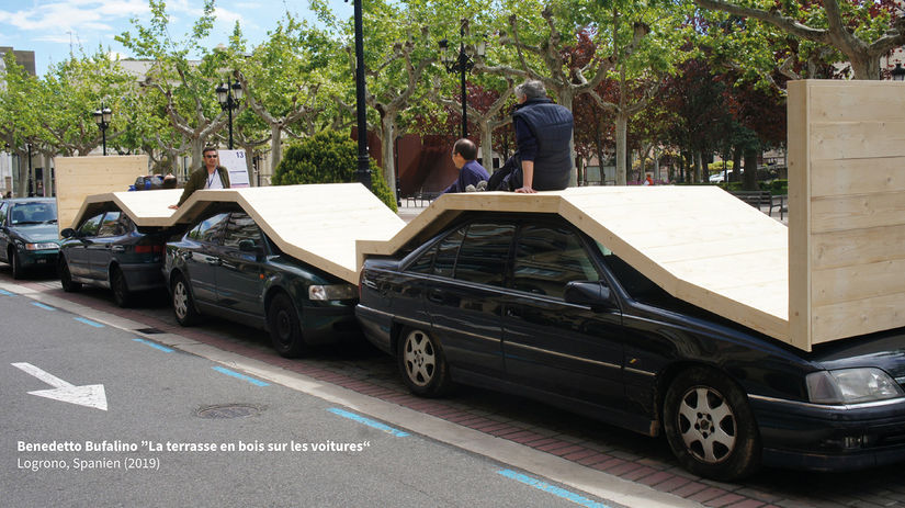 Benedetto Bufalino's installation "The Wooden Deck of Cars" presents a critical examination of the car and its environment. The artist is known for including motorized private transport (MIV) in the installations and working for and with the residents in his projects. What is the social added value of the car for the residents? And can't this space be used more sensibly and effectively?